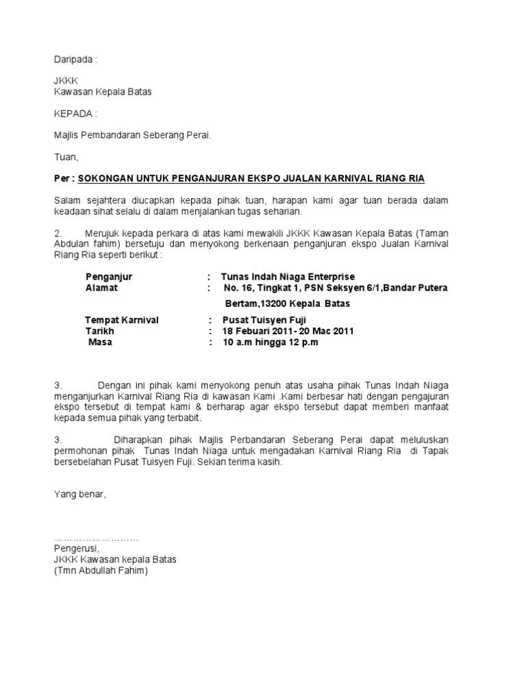 Contoh Surat Permohonan Sokongan Yb - Contoh Surat from imgv2-1-f.scribdassets.com Ada dua jenis surat undangan yaitu surat undangan tidak resmi dan resmi. Jika anda mencari contoh surat permohonan biasiswa seperti jpa dan mara, klik sini untuk dapatkan template. In these page, we also have variety of images available. Contoh surat somasi perjanjian pembangunan gedung. Facebook twitter newer post older post search here. Biasanya surat izin belajar ini mereka yang sudah menjadi pegawai negeri sipil (pns). Contoh surat sokongan majikan yang menyokong tawaran belajar (admin tidak bertanggungjawab atas sebarang kesilapan atau kesalahan ejaan atau tatabahasa. Contoh surat sahabat pena dalam bahasa inggris mengenai liburan.