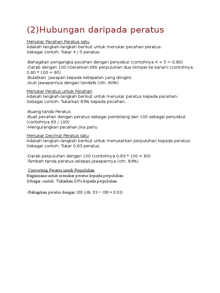 Apabila menukar pecahan atau nombor perpuluhan kepada peratus, tukarkan pecahan atau nombor perpuluhan itu dengan 100%.