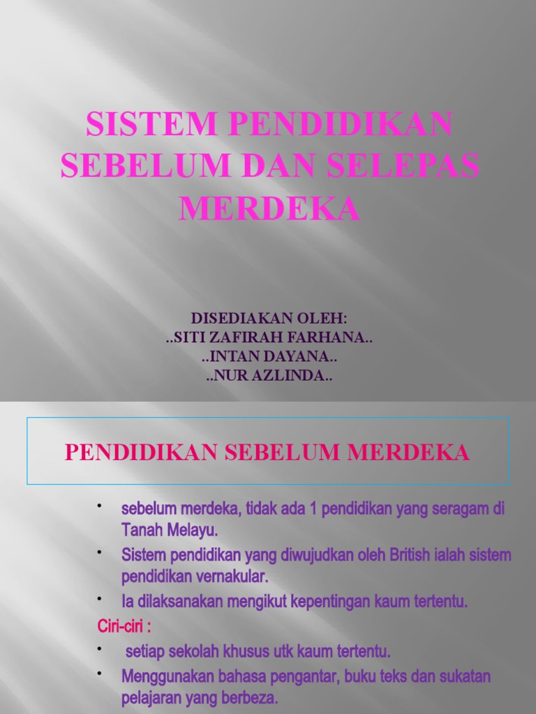 Sistem Pendidikan Sebelum Merdeka from image.slidesharecdn.com Selepas kedatangan british, sistem pendidikan semakin berkembang. Sebelum berlakunya kemerdekaan di tanah melayu sistem pendidikan di negara ini masih lagi berpecah dan berlaku perbezaan kaum dalam 2.0 hala tuju pendidikan selepas merdeka. Apabila negara mencapai kemerdekaan pada tahun 1957 untuk memenuhi keperluan negara yang merdeka dan mengembangkan sistem pendidikan. Sistem pendidikan pra kemerdekaan 1 penyata razak 1956 dan ordinan pelajaran 1957. Pendidikan sebelum merdeka ( 1941 hingga 1956 ) waktu pemerintahan jepun (1941 hingga 1956 ) pendidikan tamil dan pendidikan melayu diteruskan selepas tamat perang dunia kedua 1946 , inggeris kembali semula ke tanah melayu. Perkembangan sistem pendidikan negara sebelum dan selepas merdeka. Sebelum mengubah sistem pendidikan kita perlu melakukan pendekatan psikologi pendidikan, dan juga sangat perlu penegasan revolusi mental terhadap tenaga pendidik dan yang dididik supaya tujuan pendidikan tersebut dapat tercapai secara maksimal. Keadaan sistem pendidikan diwaktu ini bercelaru, orang.
